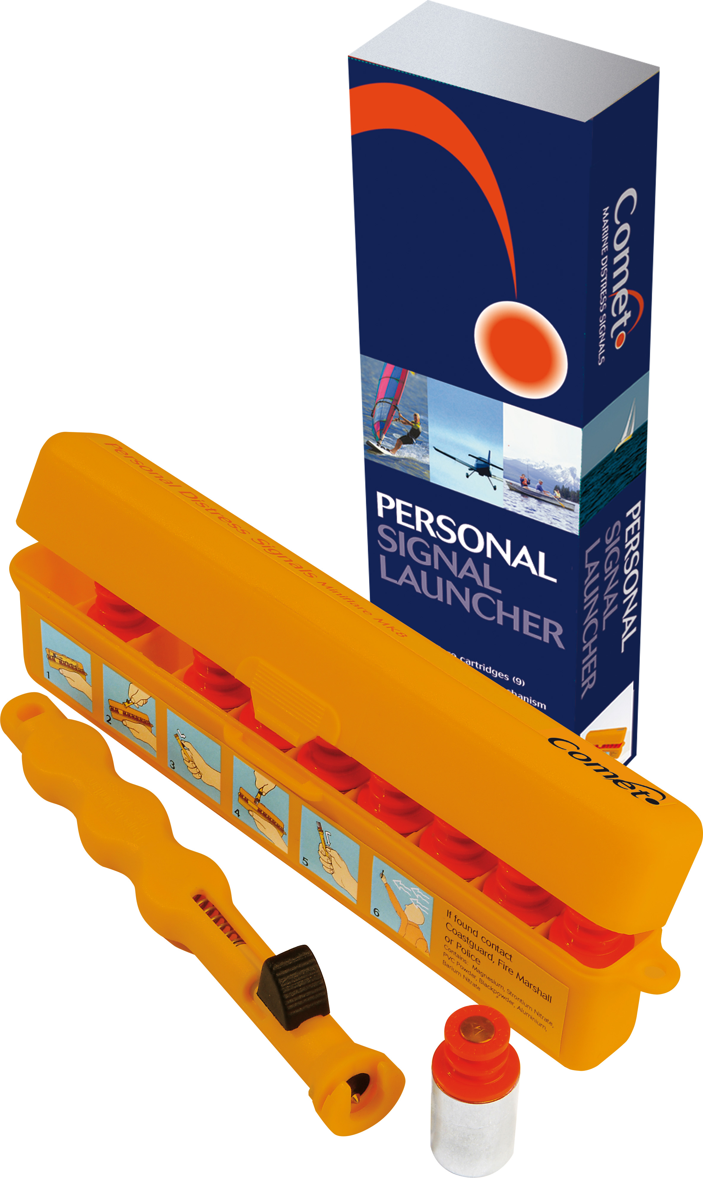 Set: Signalgeber, 9 Signalpatronen rot und einer Aufbewahrungsbox.