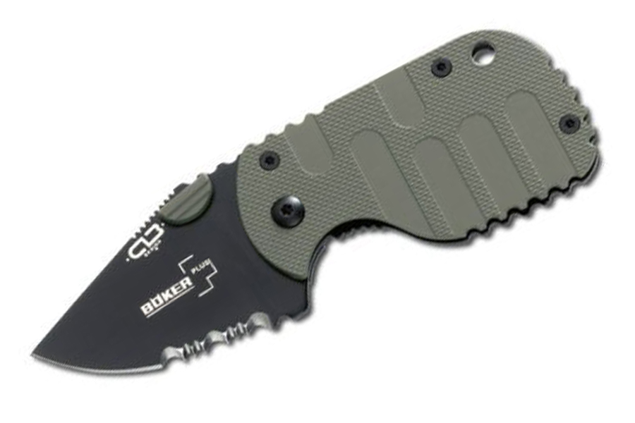 Die AUS-8-Klinge mit partiellem Wellenschliff ist 4,8 cm kurz und lässt sich butterweich öffnen und schließen. Die Frame Lock-Sicherung klickt hörbar in beiden Positionen ein. Eine olivfarbene Zytel-Schale erhöht die Griffsicherheit. Die 2 mm starke rostfreie Stahlplatine auf der Rückseite ist gleichzeitig Klingensicherung und nimmt einen strammen Clip auf (Tip-Up). Er kann aber auch umgeschraubt werden (Tip-Down).